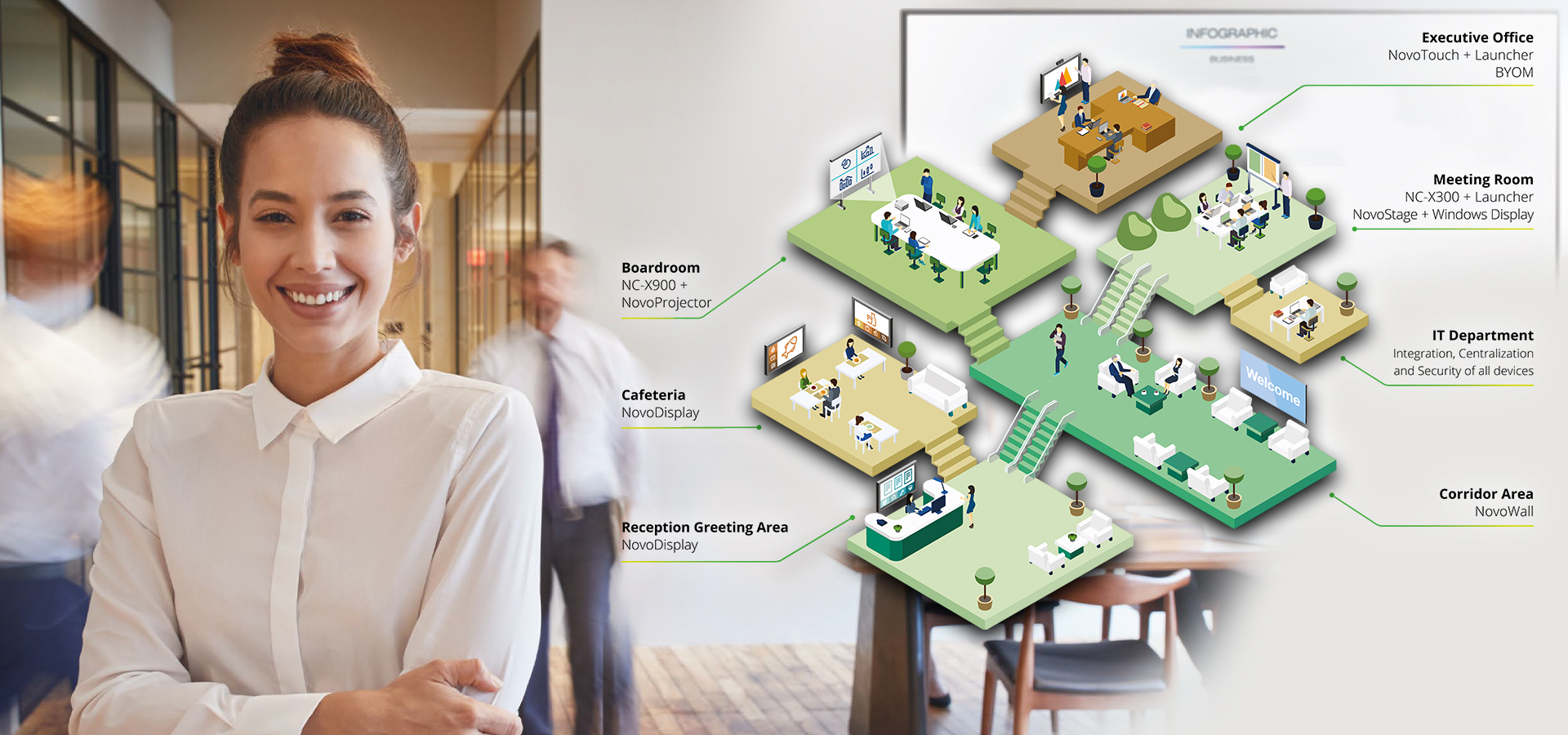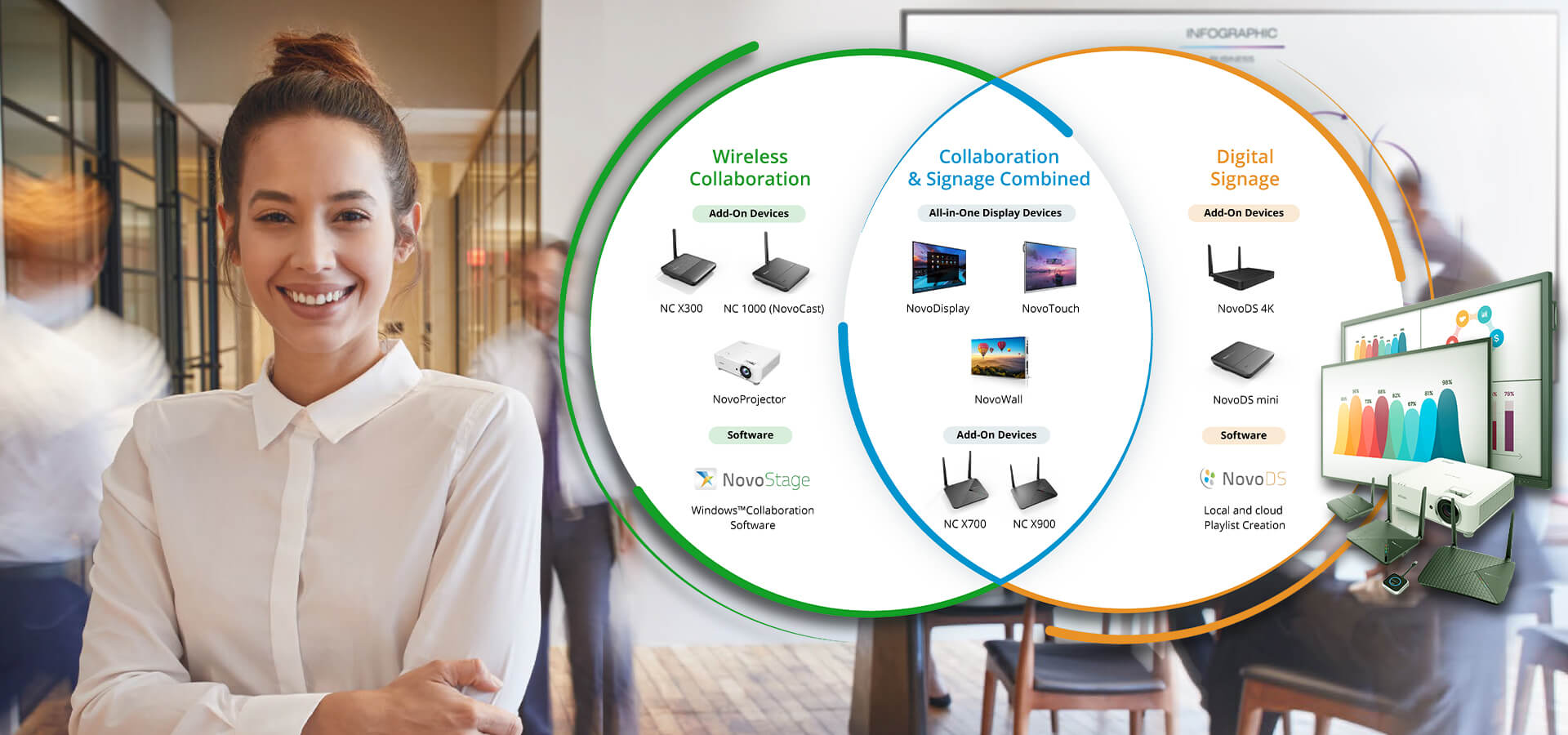 Empower your team with the innovative Novo Ecosystem. This versatile solution provides a collaborative platform for sharing ideas, brainstorming, and working together on projects. The NovoTouch displays are just an example, featuring a stunning 4K Ultra HD display, responsive touch technology, and wireless screen-sharing capabilities, allowing team members to present and interact with content effortlessly.